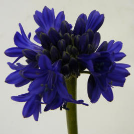 Agapanthus Sofie:Origin : hybrid and is deciduousFlower form : compact with many flowersHeight : 60 - 80 cmWidth : 60 cmColor : striking dark blueStems per plant: more than 50Bloom period : half of June till the beginning of SeptemberDurability : minimum one weekon vase without droppingsWinter hardy : yes, if you cover the plant, it will sustain most winters in full soil without a problemPlant : desires a sunny place and the plant is excellent as a a cutflower, borderplant and as a gardenplant Agapanthus Sofie:- PBR EU: 30635- PP USA : 21499For more information:See contact und arisz@arisz.nl